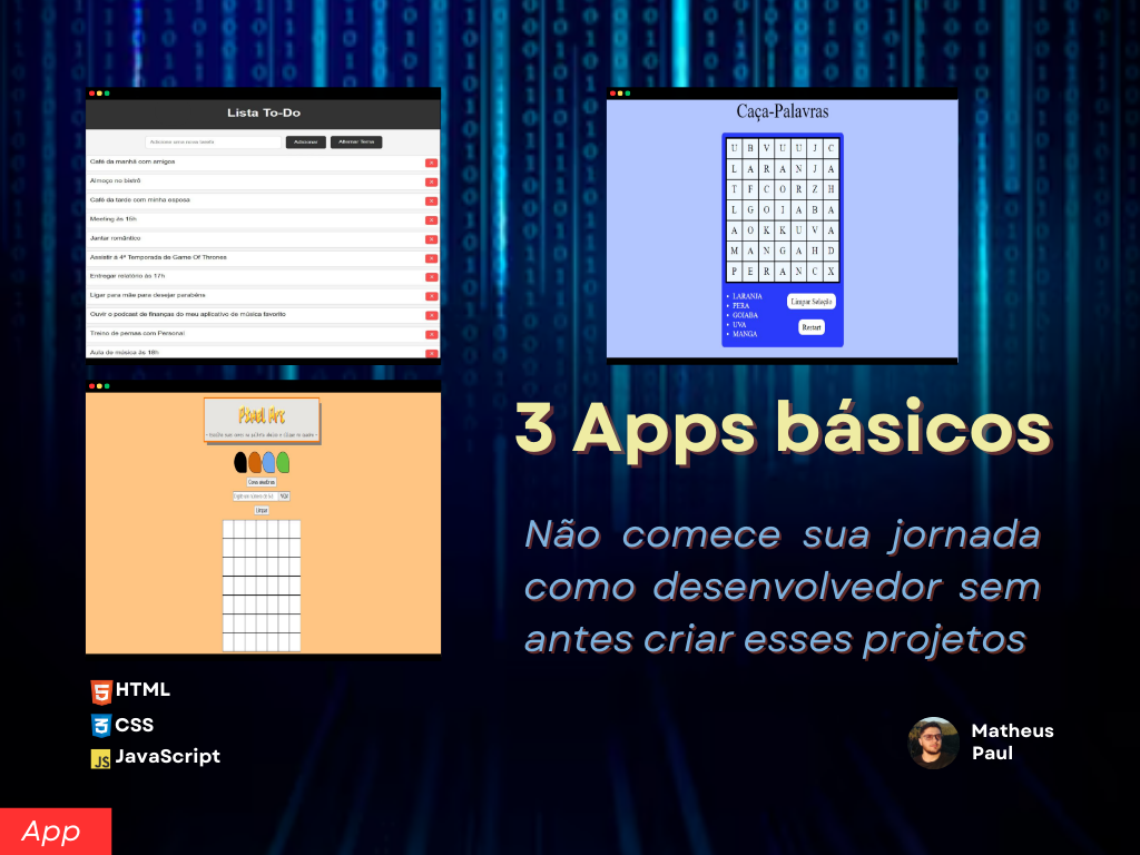O primeiro contato dos Desenvolvedores com HTML, CSS e JavaScript. To-do List, Caça-Palavras e Pixel Art